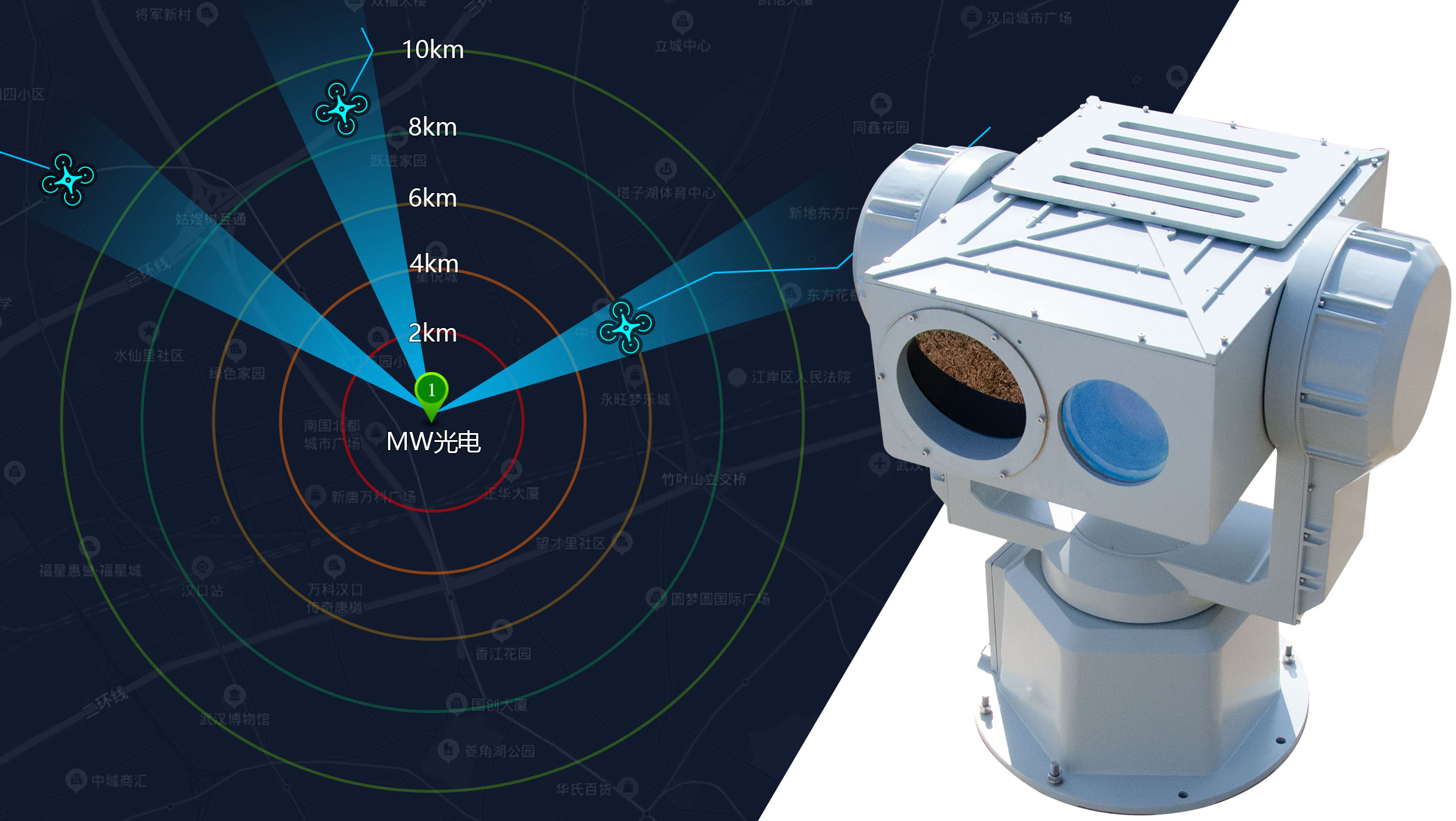 光电跟踪系统是通过安装在高精度大扭矩电驱转台上的高倍数可见光成像设备与大口径红外热成像设备于一体的光学图像跟踪系统,通过高倍数的可见光摄像机可将远距离的无人机进行放大,再通过图像识别算法进行识并驱动转台进行跟踪,在起雾、光线暗淡、夜间等可见光不能正常搜索目标是还可通过红外热成像设备进行探测跟踪无人机。