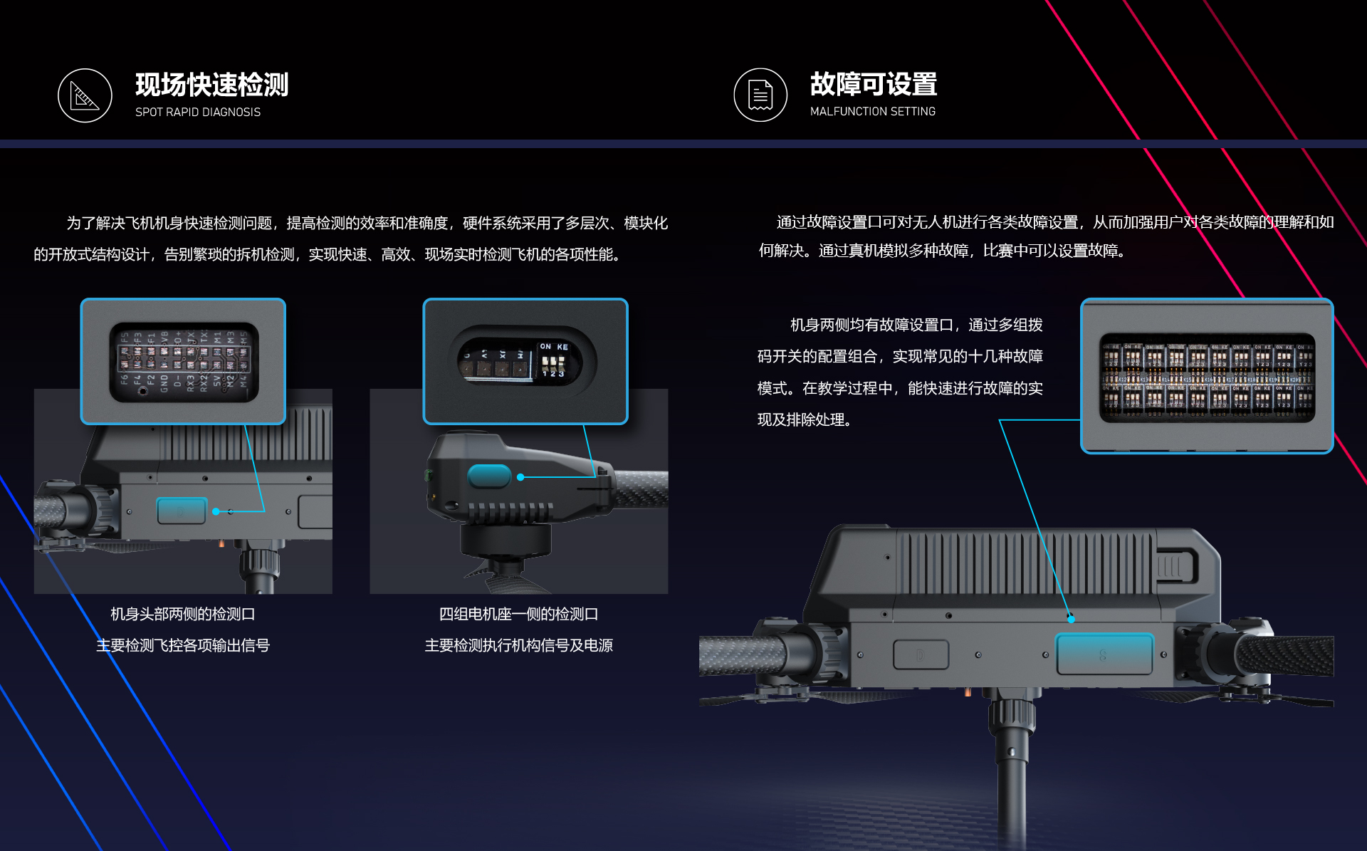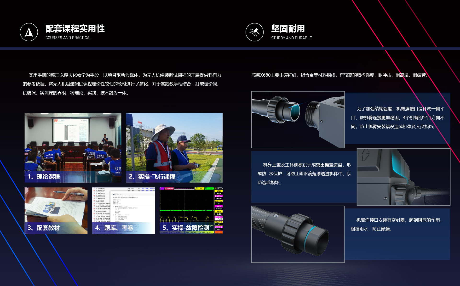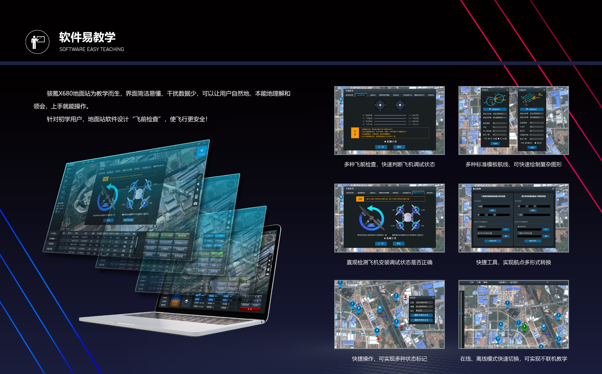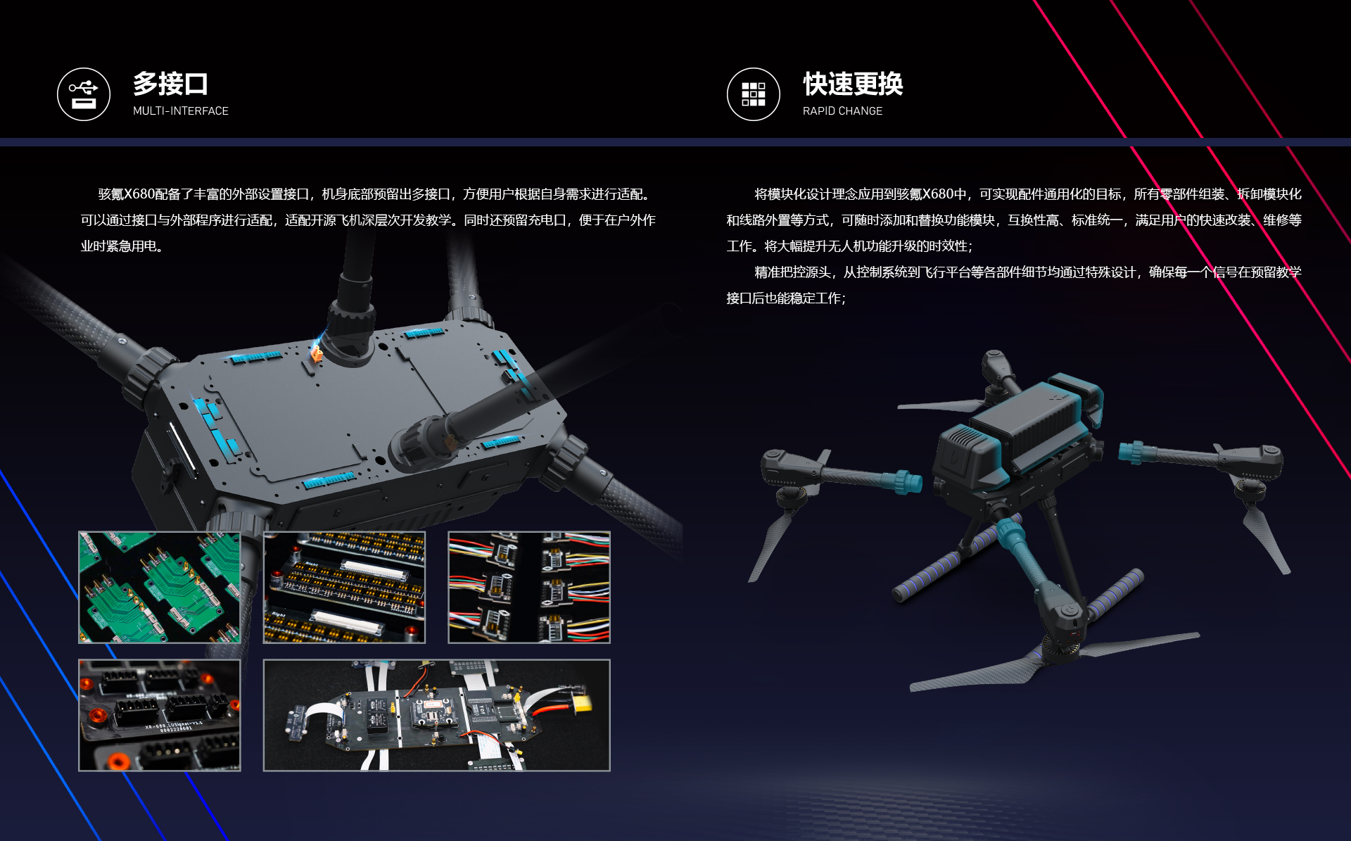 骇氪系列教学训练无人机专为教学、比赛、开发、应用扩展而设计,在空间、体积、重量受到严格控制的前提下,完成了功能模块化、接口标准化、载荷模组化等功能的实现,同时当有任务需求时,骇氪X680可随时投入到应用中,实现一机多用。